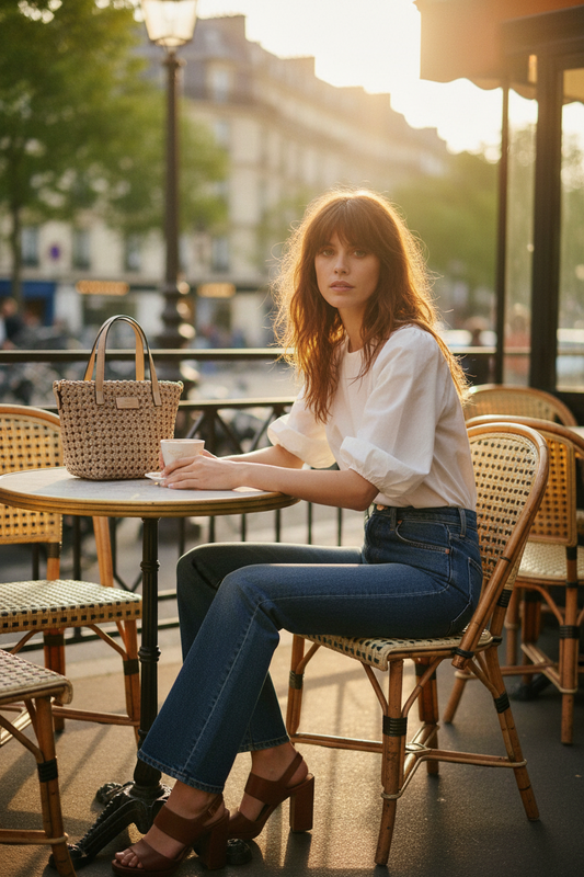 Los accesorios definen el gesto: sandalias tipo cangrejera en crudo, bolso mini de esencia artesanal y gafas de sol en crudo con patillas en carey, un guiño clásico que eleva el conjunto.