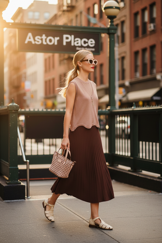 La falda plisada en marrón con un toque rojizo aporta movimiento y profundidad, acompañando cada paso con una fluidez casi hipnótica.