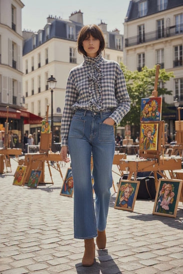 Camisa de estilo romántico con cuello y puños adornados con un pequeño volante . El estampado de vichi en tono azul pálido le añade un toque refrescante ideal para esta temporada